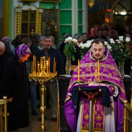 Во время Богослужения были прочитаны следующие отрывки из Святого Писания: Лит. Евр.9:11-14 (зач. 321 от полý). Мк.10:32-45 (зач. 47). Прп.: Гал.3:23-29 (зач. 208). Лк.7:36-50 (зач. 33). Литургия св. Василия Великого.