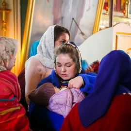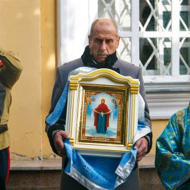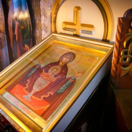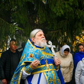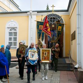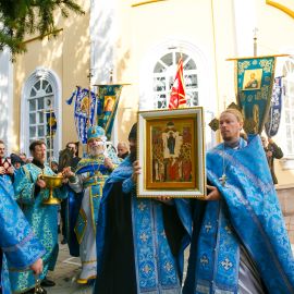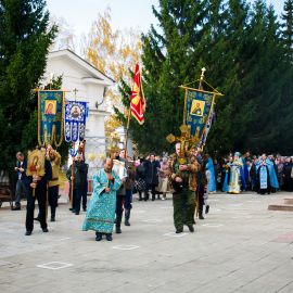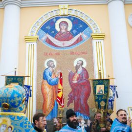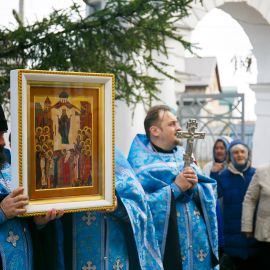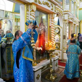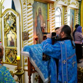 Перевод: В сей день мы, правоверные люди, торжественно празднуем, осеняемые Твоим, Богоматерь, пришествием; и, взирая на Твой пречистый образ, со умилением взываем: «Покрой нас священным Твоим Покровом и избавь нас от всякого зла, умоляя Сына Твоего, Христа Бога нашего, спасти души наши».