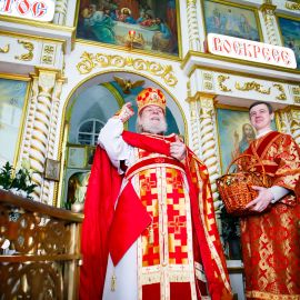 Бросать пасхальные яйца в руки верующих - это традиция. С Пасхальным приветствием "ХРИСТОС ВОСКРЕСЕ!" настоятель собора протоиерей Сергий Снопков щедро одарил радостных прихожан расписными яйцами.