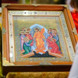 Перевод: Воскрес Ты, как Бог, из гроба во славе и мир с Собою воскресил. И естество человеческое как Бога воспело Тебя, и исчезла смерть. Адам торжествует, Владыка, и Ева ныне, от уз избавляемая, радуется, взывая: «Ты, Христе, всем даруешь воскресение!»