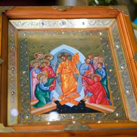 Перевод: Воскрес Ты в сей день из гроба, Милосердный и вывел нас из врат смерти. В сей день Адам ликует и радуется Ева, а вместе с ними и пророки с патриархами воспевают непрестанно божественную мощь власти Твоей.