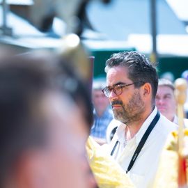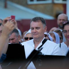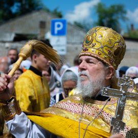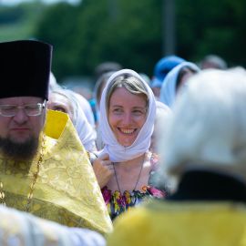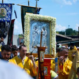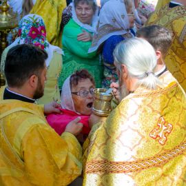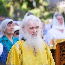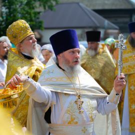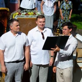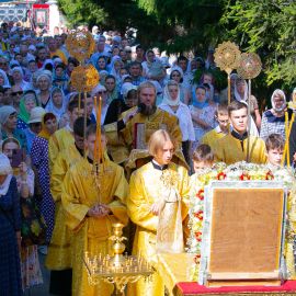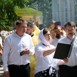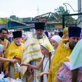 Крестный ход по совершении молебна отправился во двор Собора, где по благословению настоятеля прот. Сергием Снопковым всем присутствующим были предложены угощения.