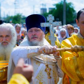 По окончании Божественной Литургии состоялся Крестный ход вокруг Собора. У мозаичной иконы святых апостолов Петра и Павла был совершен молебен святым первоверховным апостолам Петру и Павлу. По окончании молебна были провозглашены Уставные Многолетия Священноначалию Церкви Нашей, Богом хранимой стране нашей Казахстанской, Президенту, властям, воинству и народу её, всем жителям города Петропавловска.