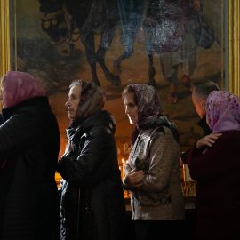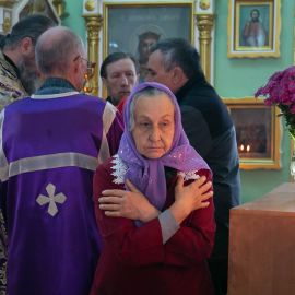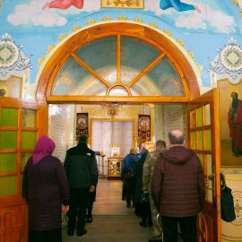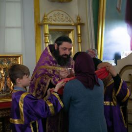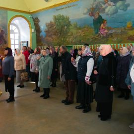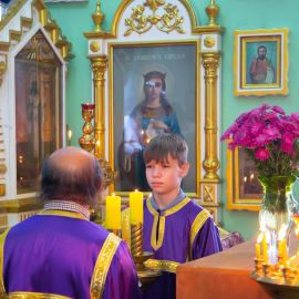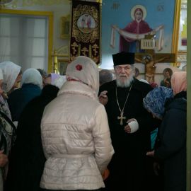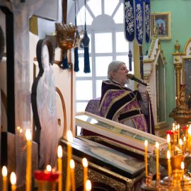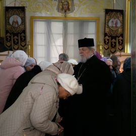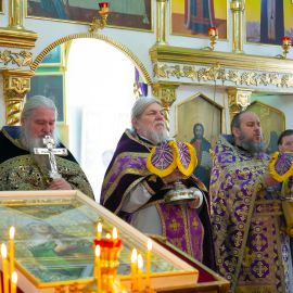 По завершении чина Воздвижения, украшенный живыми цветами Крест был помещён на праздничный аналой посередине храма. Под пение тропаря "Кресту Твоему поклоняемся, Владыко, и святое Воскресение Твое славим" священнослужители вместе с прихожанами совершили земные поклоны этой Святыне.