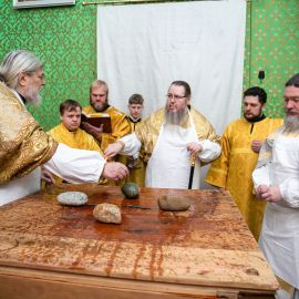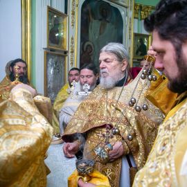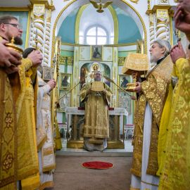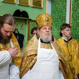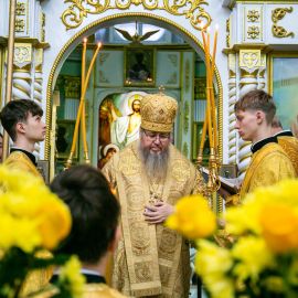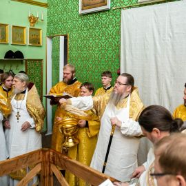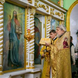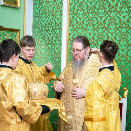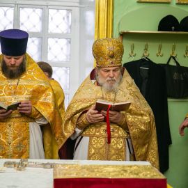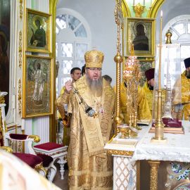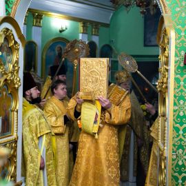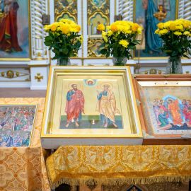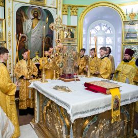 По окончании чина освящения Божественную Литургию в соборе святых апостолов Петра и Павла возглавил Высокопреосвященнейший архиепископ Петропавловский и Булаевский Владимир, ему сослужили настоятель собора митрофорный протоиерей Сергий Снопков, иерей Сергий Сафонеев, иерей Максим Черненко, иерей Павел Орлов и духовенство епархии. Песнопения Литургии исполнили большой и малый хоры собора под управлением регентов Прохоровой О.Н. и Богдановой М.В.