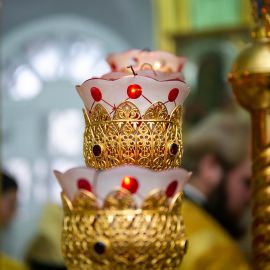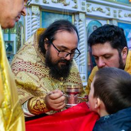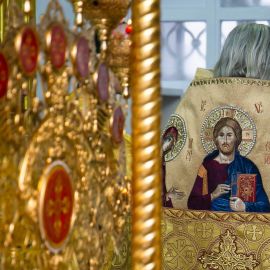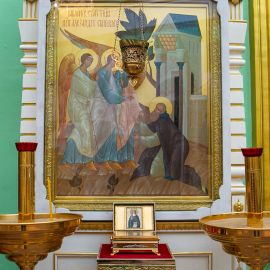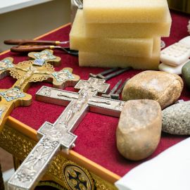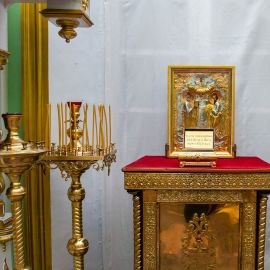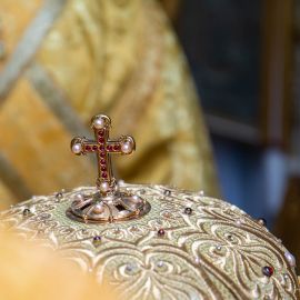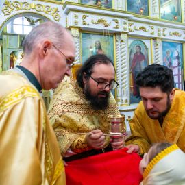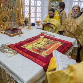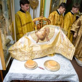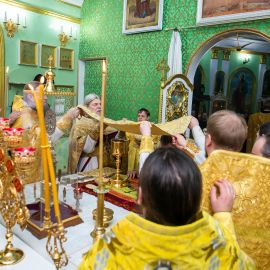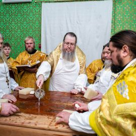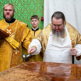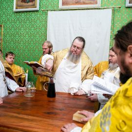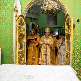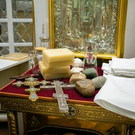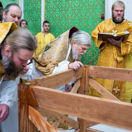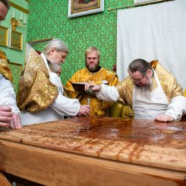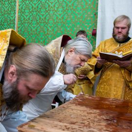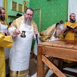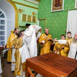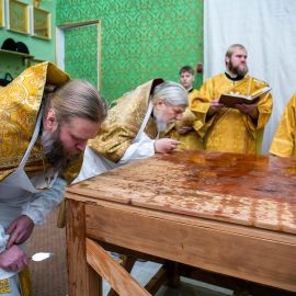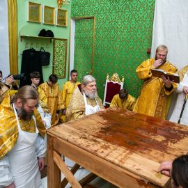 Затем престол омыли святой водой с вином, подготовив его к миропомазанию. С пением “Аллилуиа” престол был помазан святым Миром – благовонным маслом, великой святыней, символизирующей благодать Святого Духа. После миропомазания владыка возгласил: «Слава Тебе, Святая Троице, Боже наш, во веки веков!» Престол облачили в новые светлые одежды и расположили на нем Святое Евангелие, Крест Христов и священные сосуды. Отныне престол стал местом особого присутствия Божия – «страшно место сие — это Дом Божий, это врата небесные» (Быт. 28:17), и на нем за Божественной Литургией может совершаться таинство Евхаристии – принесение Животворящих Таин Тела и Крови Господа нашего Иисуса Христа.