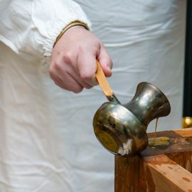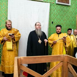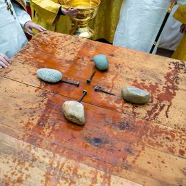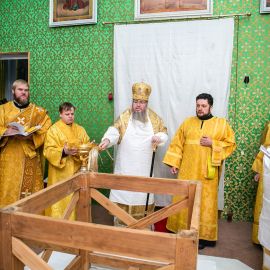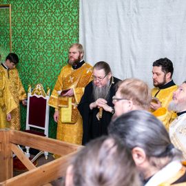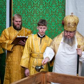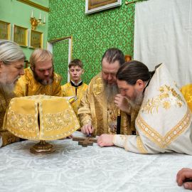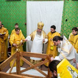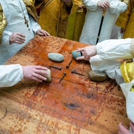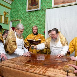 Владыка Владимир окропил столпы и углы престола святой водой и возлил на него воскомастих – особую мастику, приготовленную на основе воска и благовоний. Затем на престол была водружена верхняя доска. Ее закрепили священники четырьмя гвоздями с помощью камней. Гвозди напоминают нам о спасительных страданиях Господа Иисуса Христа за род человеческий, а воскомастих символизирует ароматы, которыми было помазано Его нетленное Тело при положении во Гроб. После утверждения престола владыка, преклонив колена со всем клиром и прихожанами, произнес молитву, в которой испросил Господа ниспослать Святого Духа, освятить храм и Свой престол.