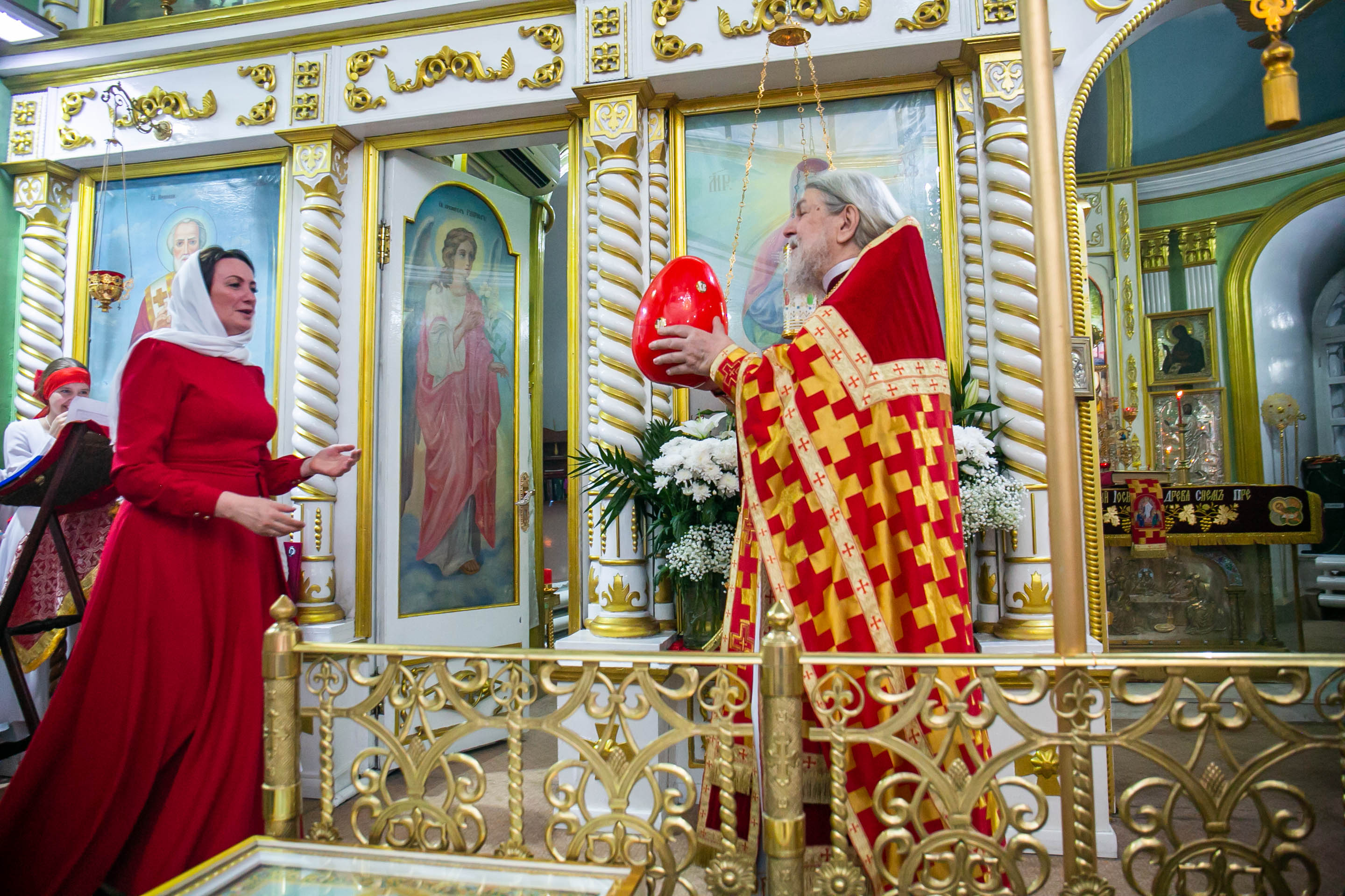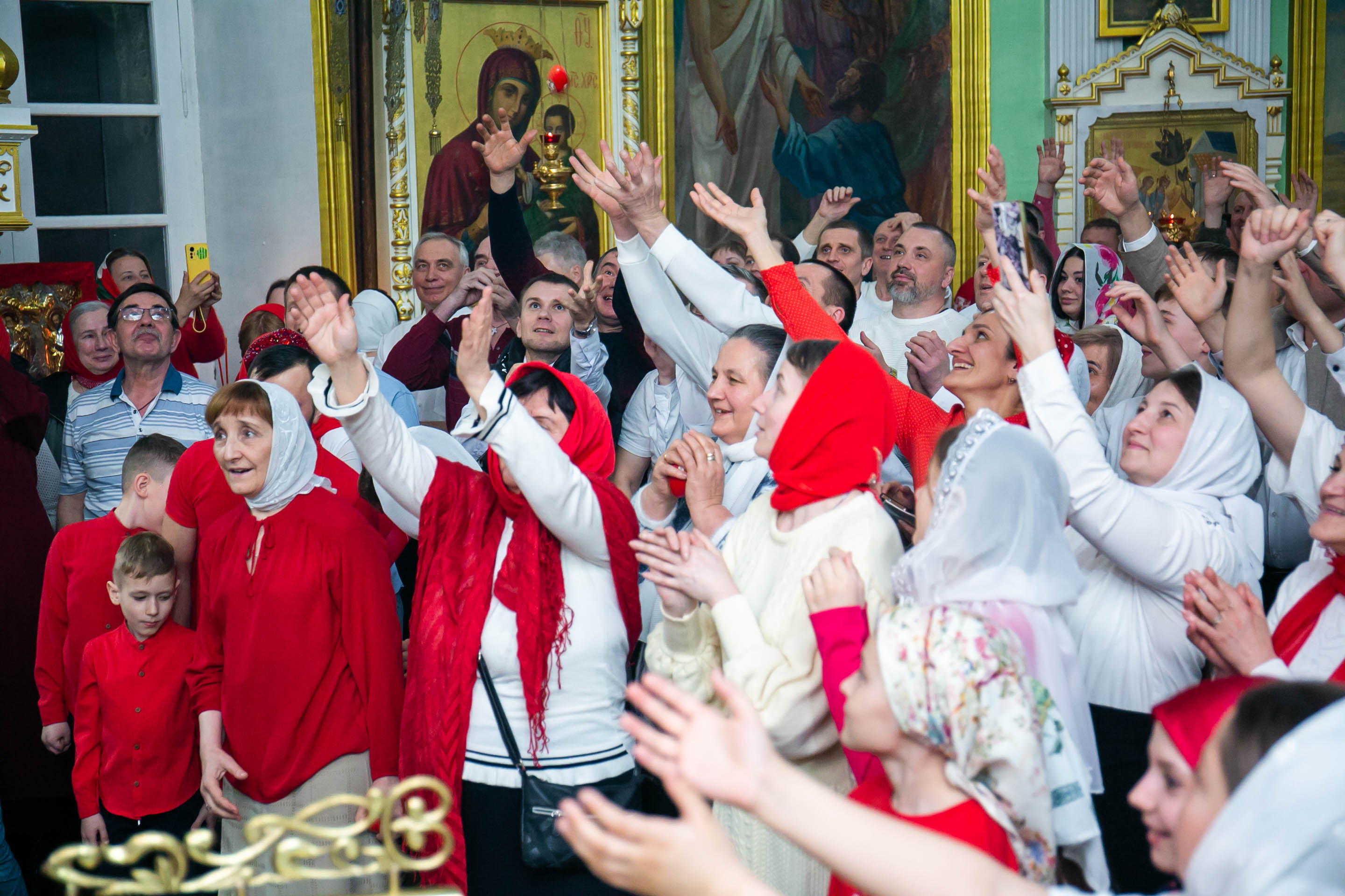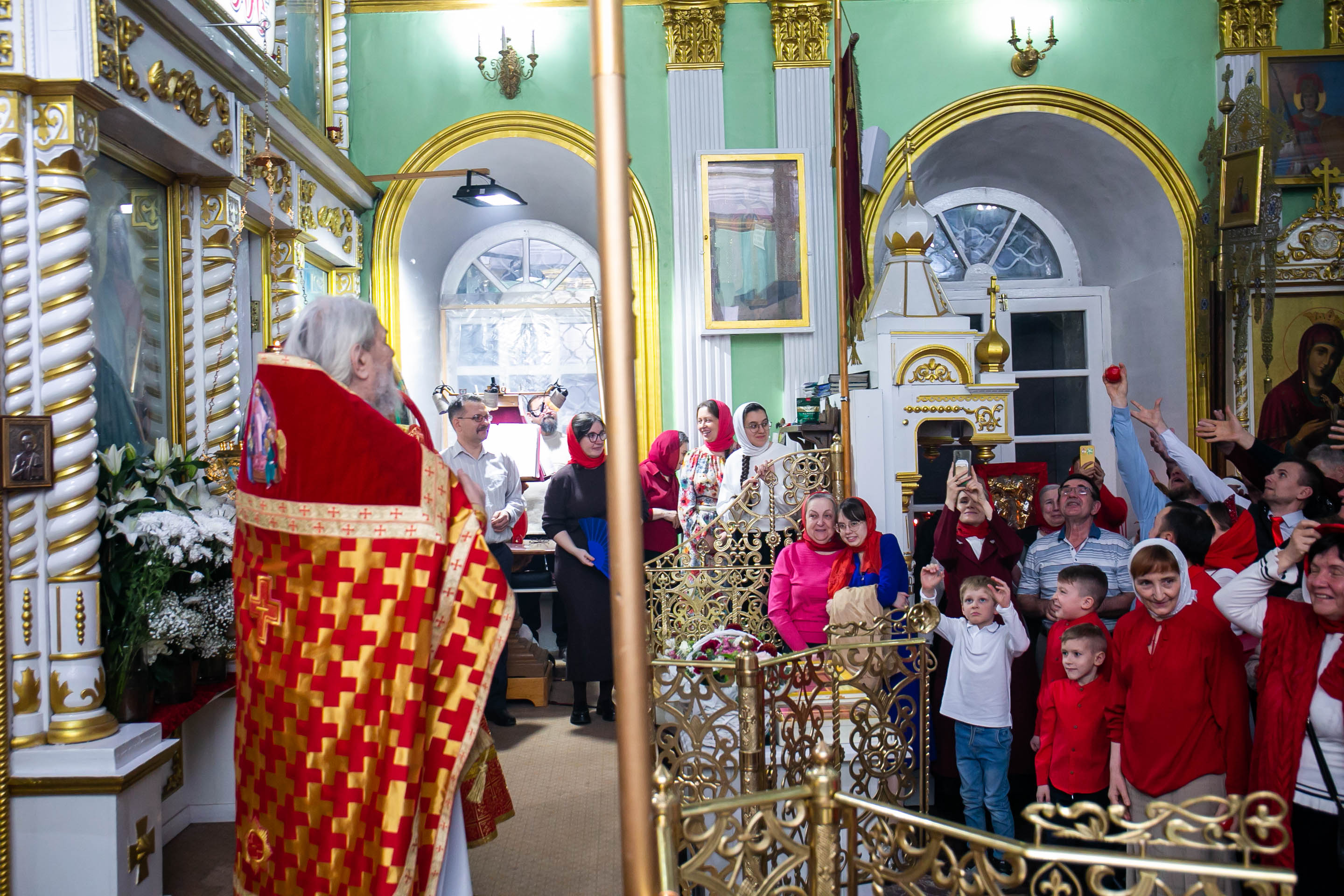 Бросать пасхальные яйца в руки верующих - это традиция. С Пасхальным приветствием "ХРИСТОС ВОСКРЕСЕ!" настоятель собора свв. апп. Петра и Павла протоиерей Сергий Снопков щедро одарил радостных прихожан расписными яйцами.