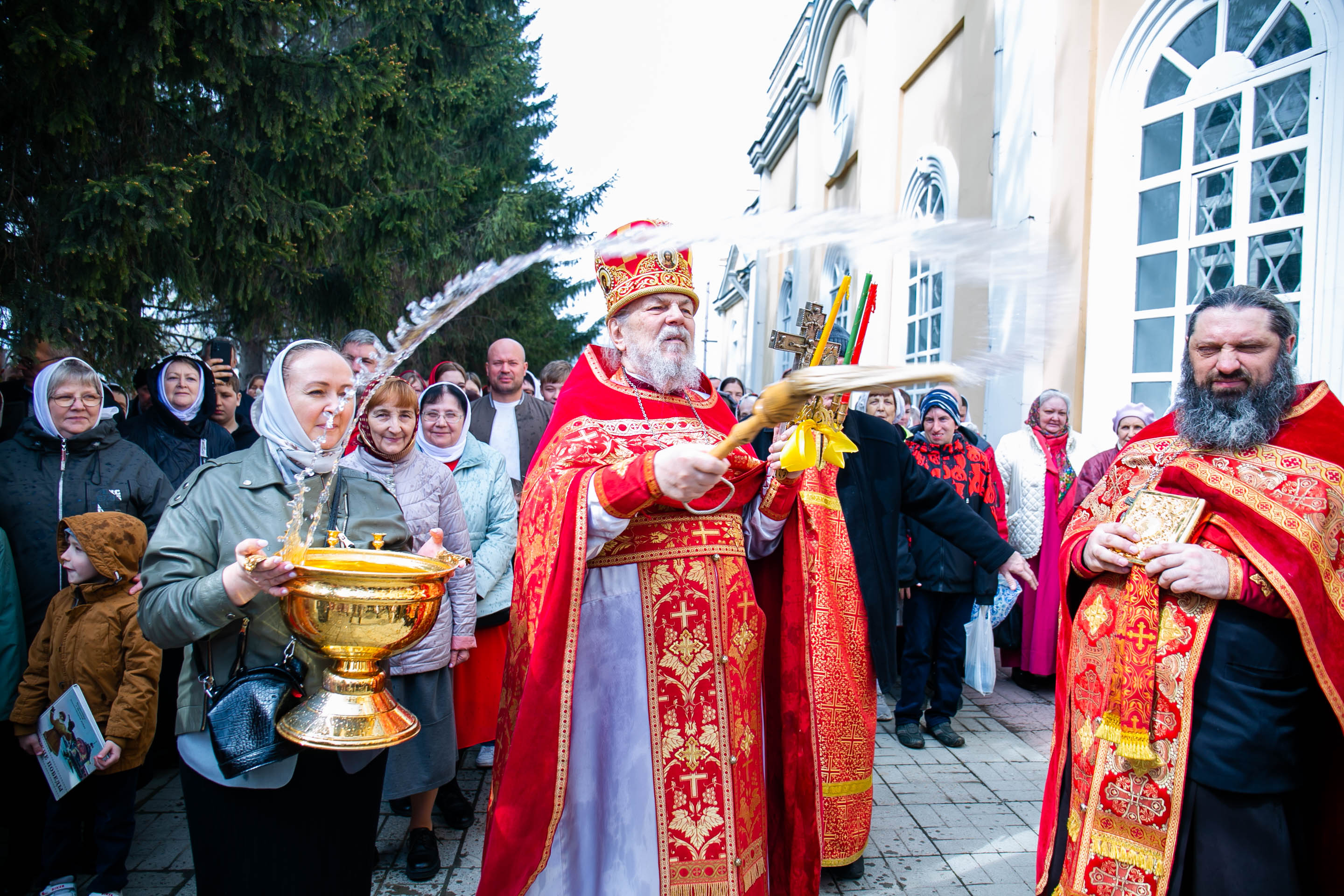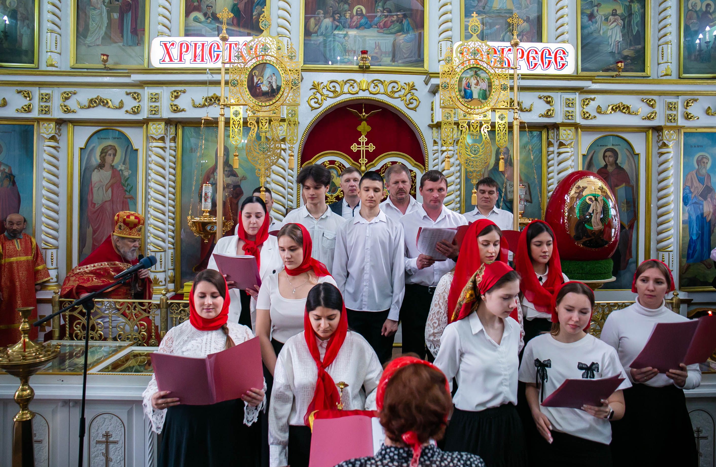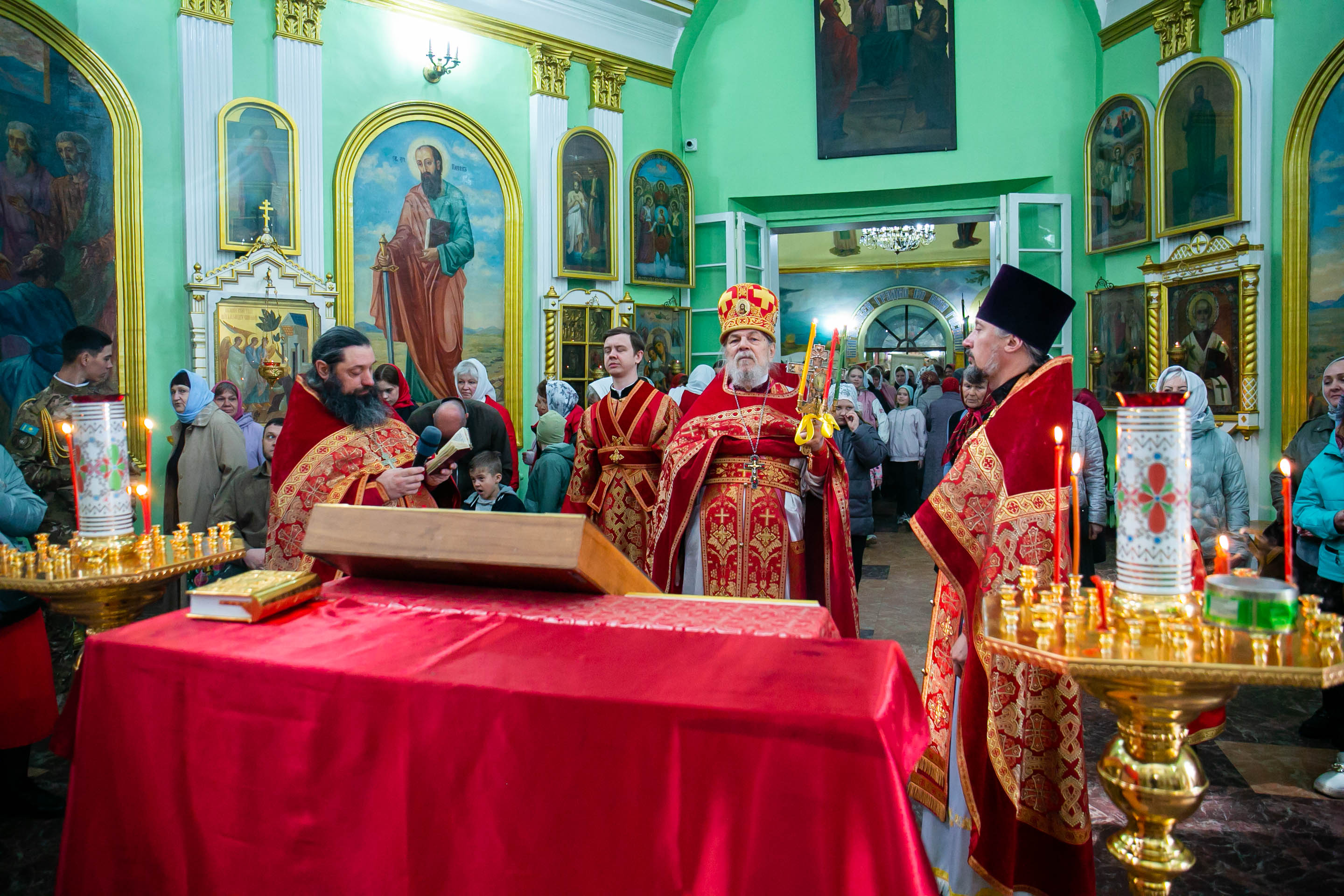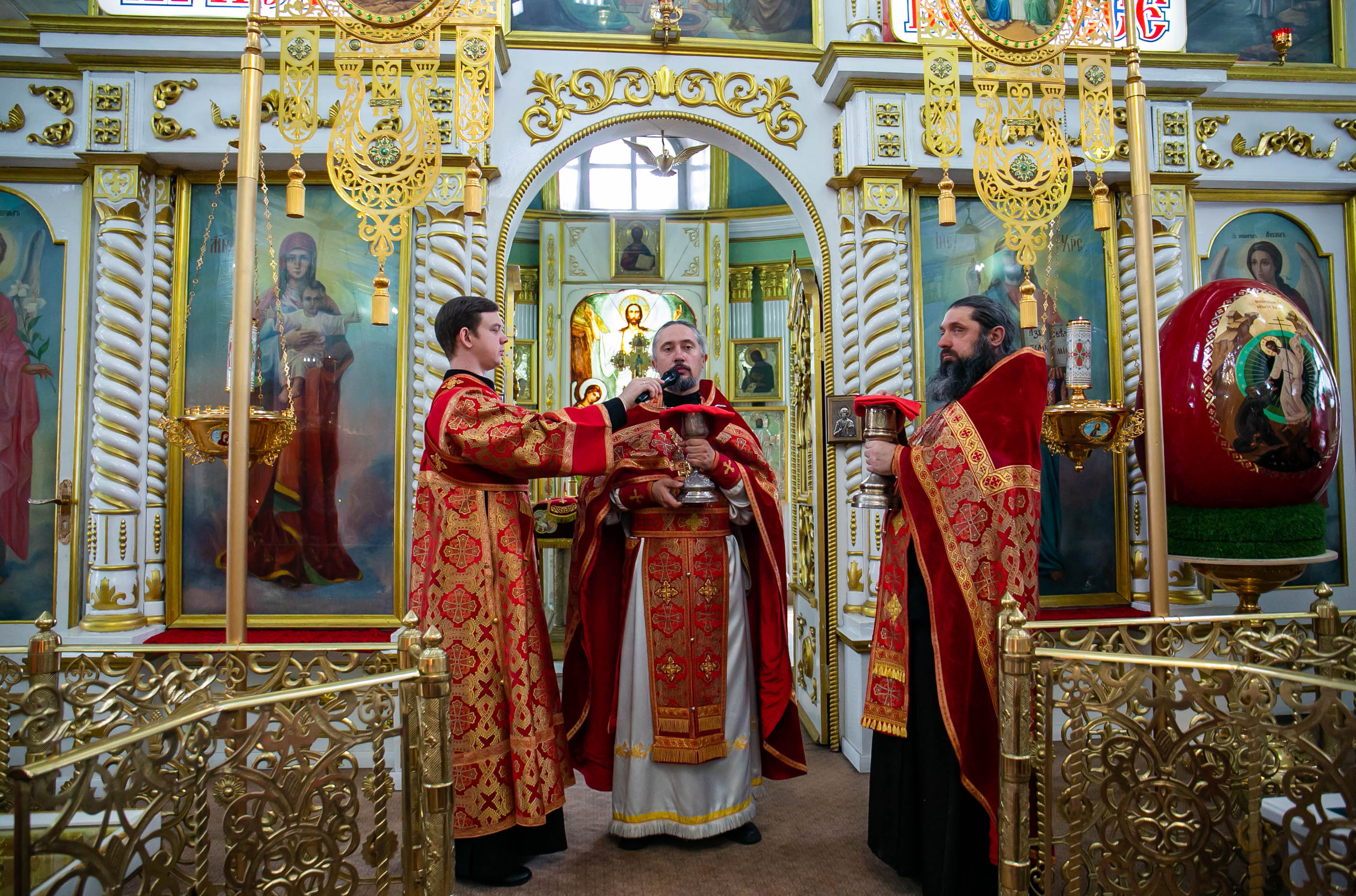 Настоятель Собора святых апостолов Петра и Павла протоиерей Сергий Снопков возглавил Божественную Литургию пасхальным чином. Ему сослужили иерей Евгений Столяров, иерей Сергий Сафонеев. Песнопения Литургии исполнили большой и малый хоры Собора под управлением регентов Прохоровой О.Н. и Богдановой М.В.