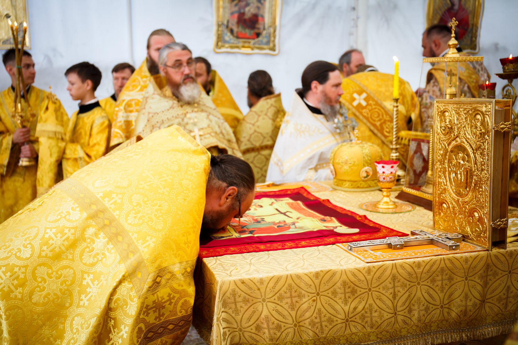 По завершении Литургии был совершен крестный ход вокруг собора, во время которого были совершены многочисленные остановки с окроплением верующих святой водой и неоднократными молитвами к первоверховным апостолам.