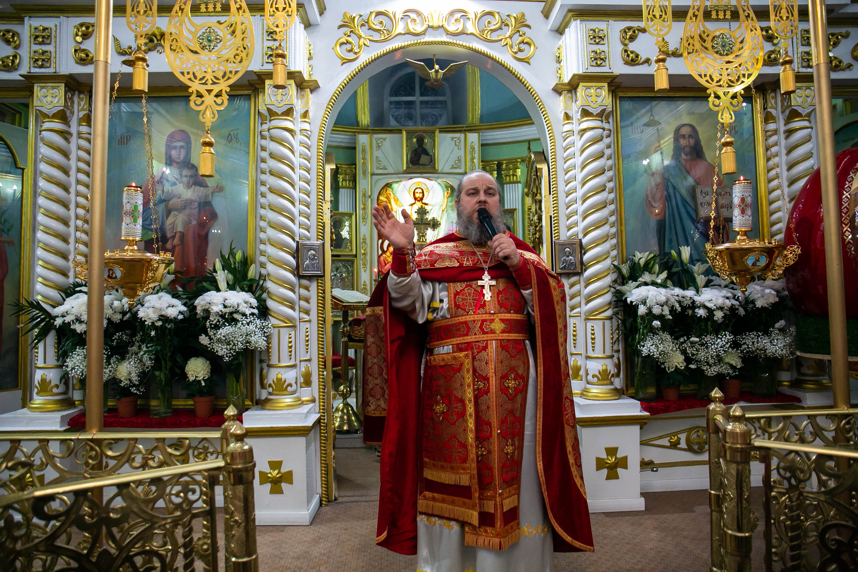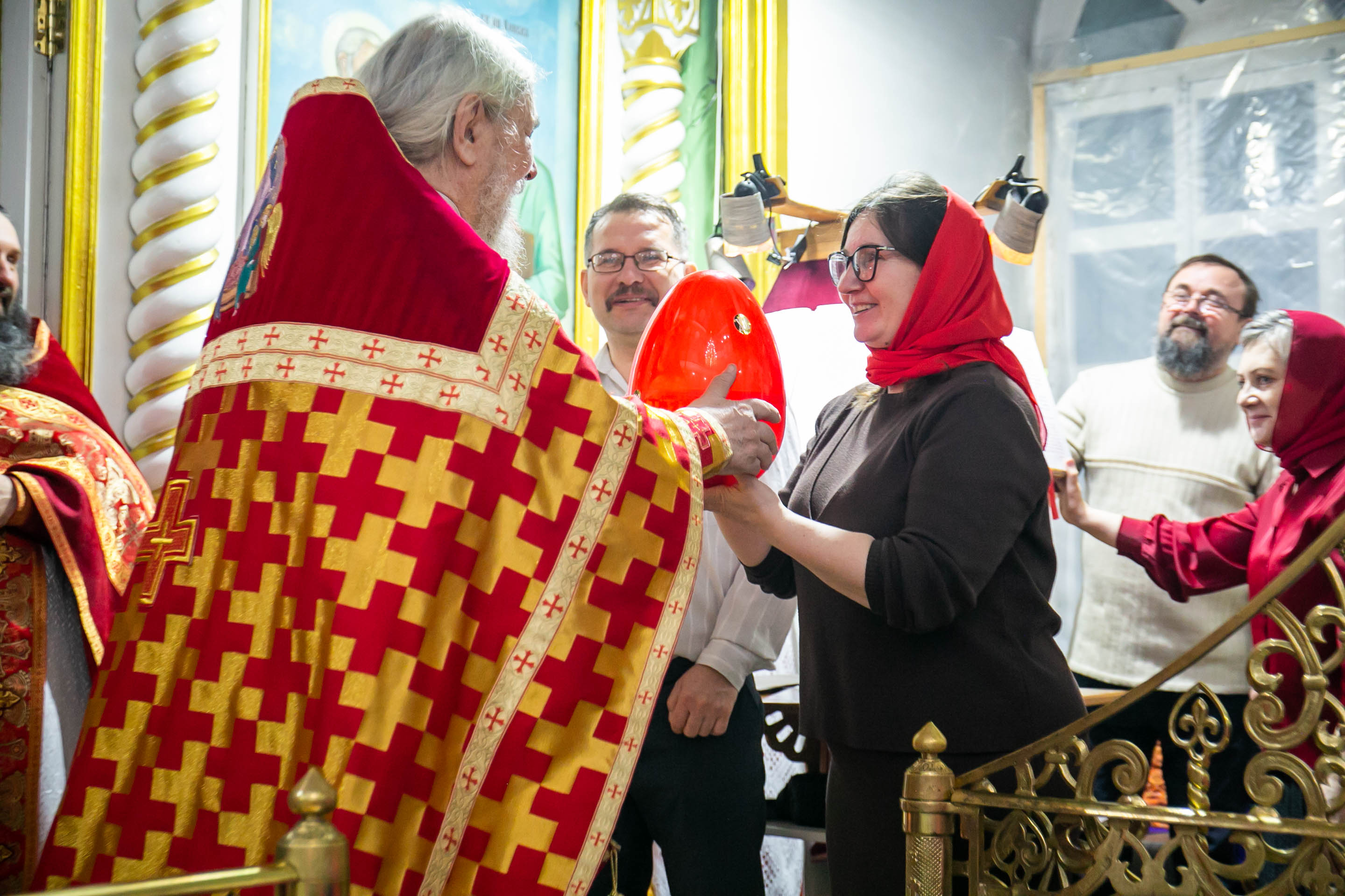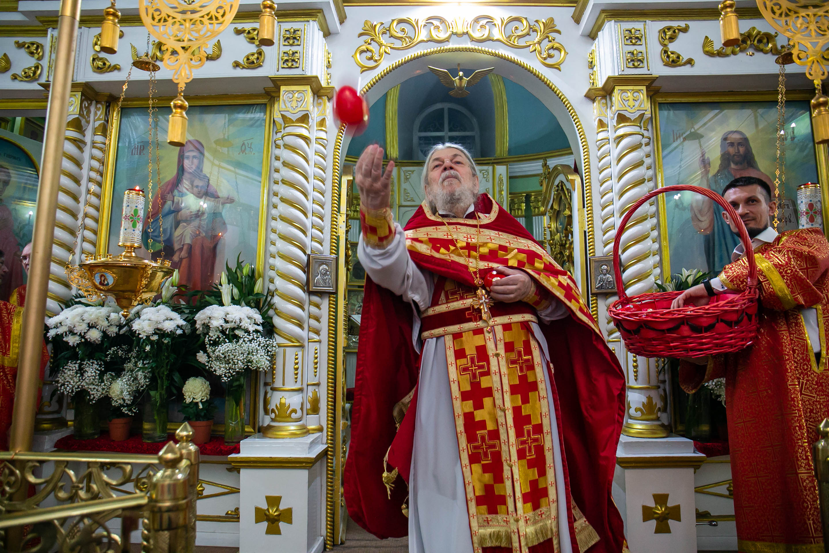 Бросать пасхальные яйца в руки верующих - это традиция. С Пасхальным приветствием "ХРИСТОС ВОСКРЕСЕ!" настоятель собора свв. апп. Петра и Павла протоиерей Сергий Снопков щедро одарил радостных прихожан расписными яйцами.
