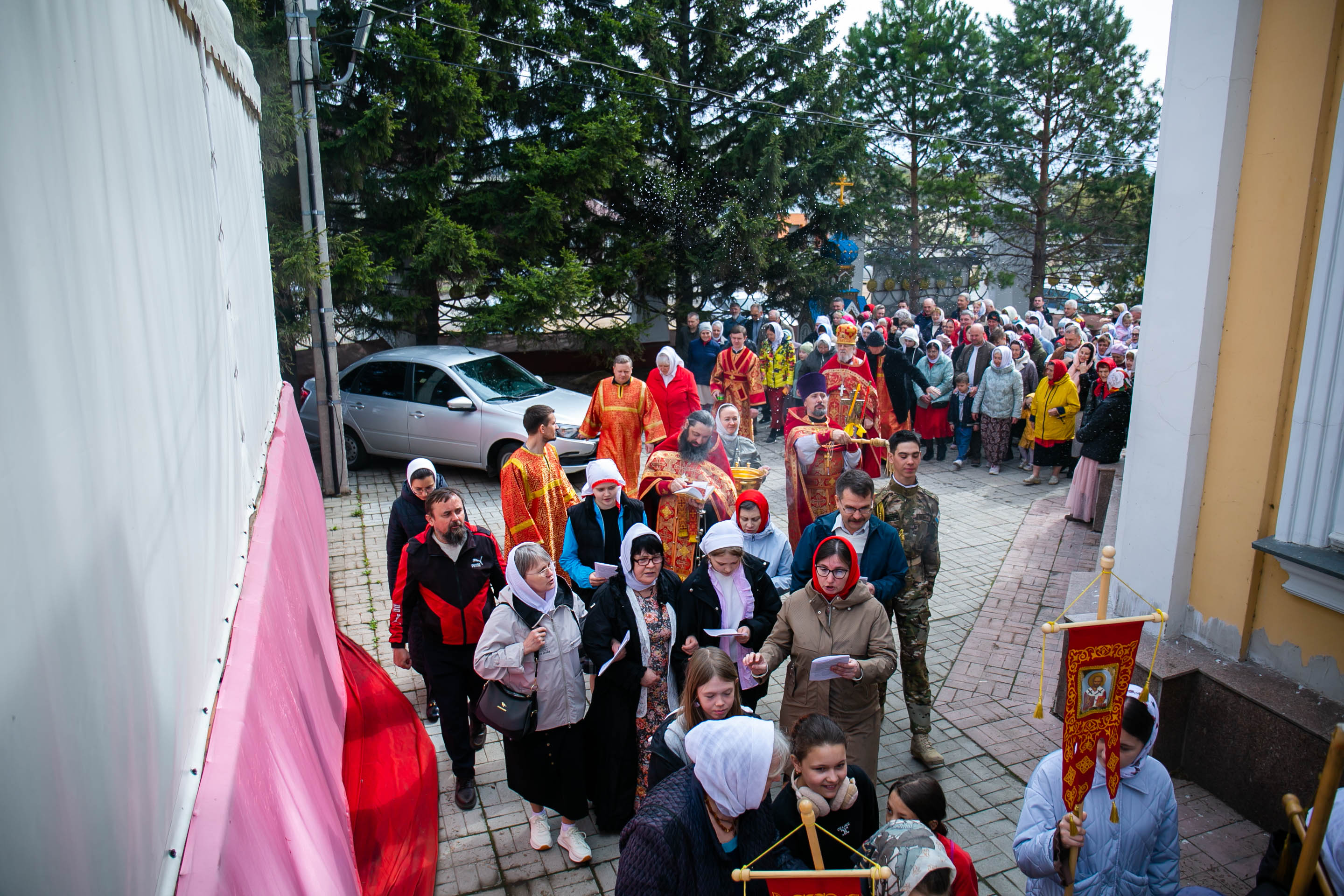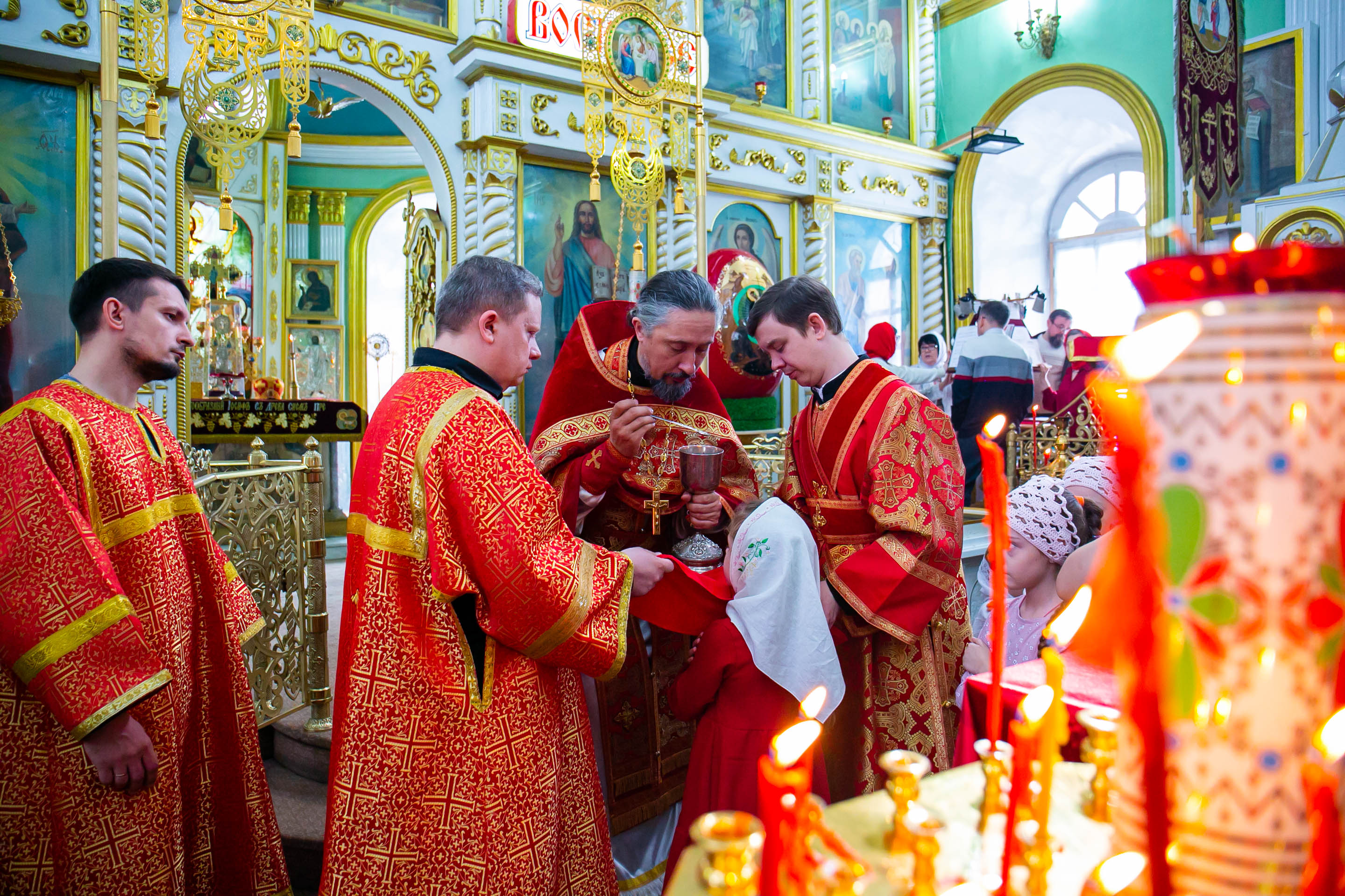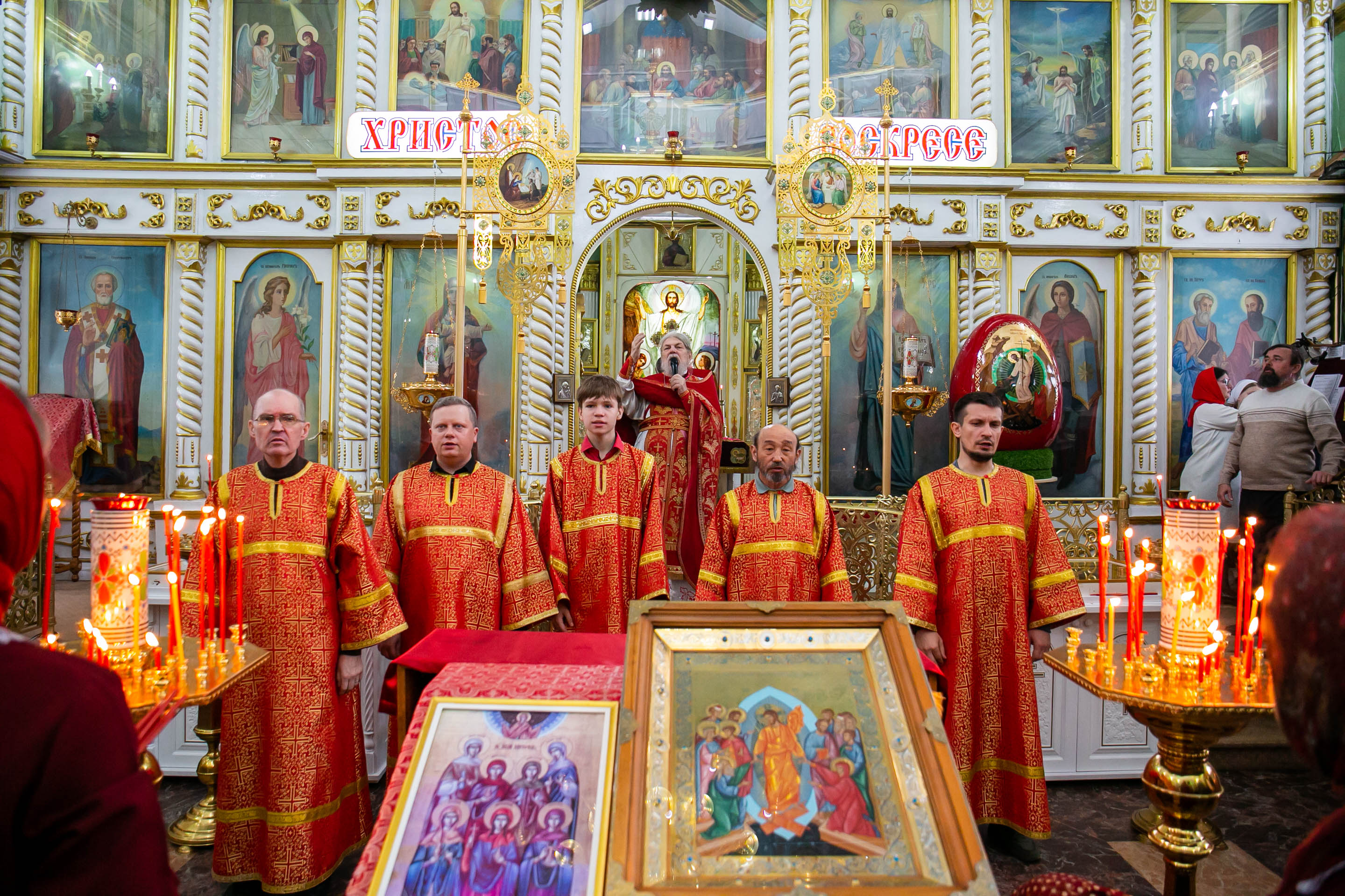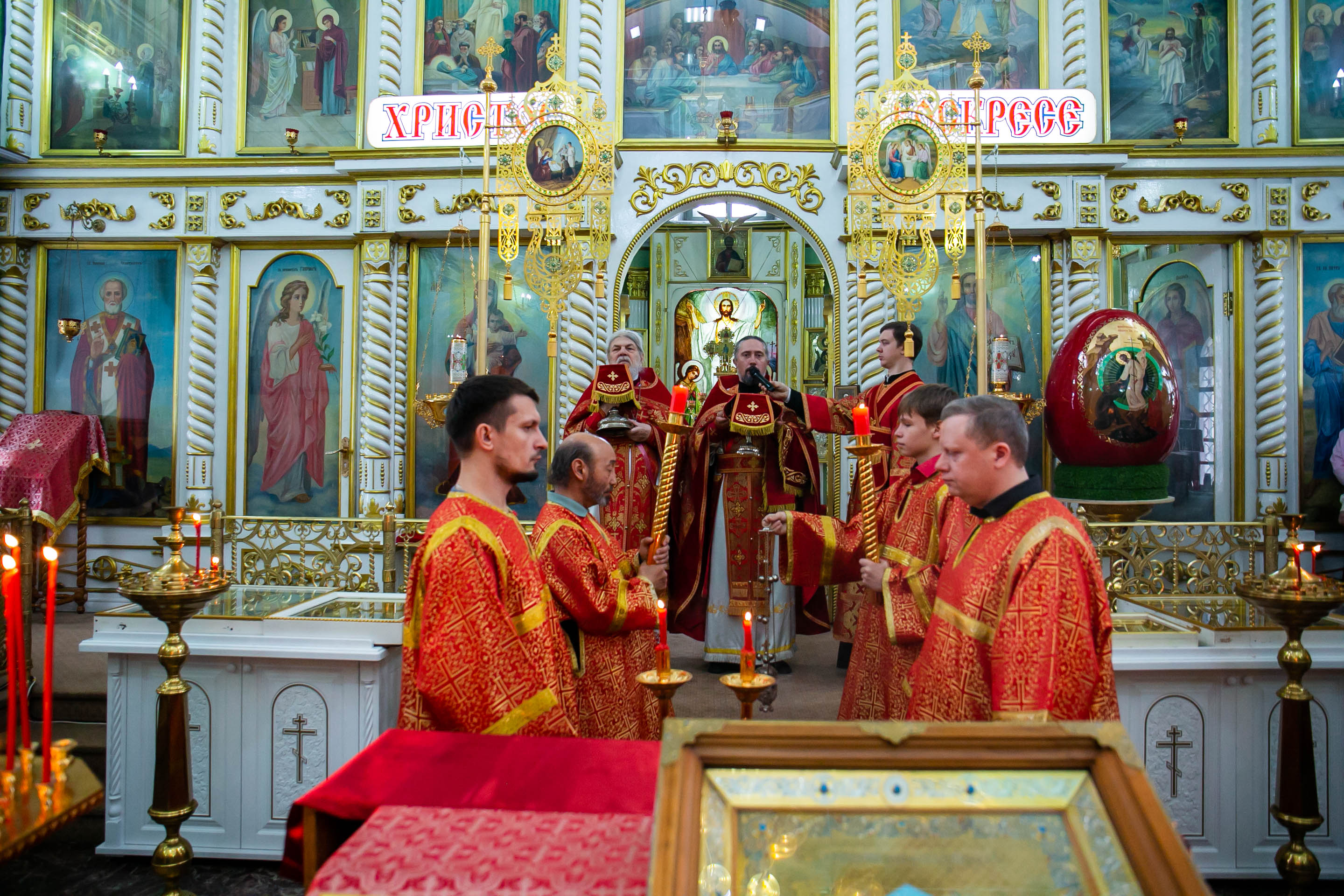 Настоятель Собора святых апостолов Петра и Павла протоиерей Сергий Снопков возглавил Божественную Литургию пасхальным чином. Ему сослужили иерей Евгений Столяров, иерей Сергий Сафонеев. Песнопения Литургии исполнили большой и малый хоры Собора под управлением регентов Прохоровой О.Н. и Богдановой М.В.